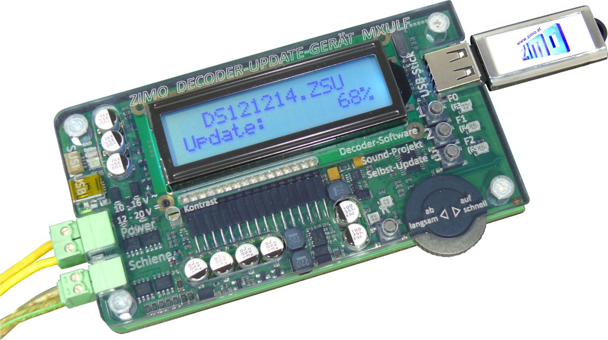 Zunächst ist das neue Update-Gerät, also MXULF, das auf den Erfahrungen mit den vorangegangenen Produkten aufbaut, ein Decoder-Update-Gerät in modernster Technik, dass die Aktualisierung und Individualisierung der Decoder besonders komfortabel und zuverlässig durchzuführen hilft: Software-Update vom USB-Stick aus für alle ZIMO Decoder und ZIMO Sound-Decoder. Sound-Projekt-Laden vom USB-Stick aus für alle ZIMO Sound-Decoder. Selbst-Update der MXULF-Software, ebenfalls vom USB-Stick aus. Für die erste - die aktuelle - Version des MXULF wurde das Software-Update und Sound-Laden vom USB-Stick aus realisiert, weil dieses Verfahren gegenüber der Unterstützung durch Software den Vorteil der Unabhängigkeit von Computer, Betriebssystem und Treibern hat. Aber auch der MXULF selbst kann einem Software-Update unterzogen werden, womit innerhalb der nächsten Monate in mehreren Ausbaustufen weitere Fähigkeiten zur Verfügung gestellt werden sollen: Fahren und Funktionen-Schalten vom MXULF aus, um die zuvor mit nuer Software oder Sound versehene Lok ohne Umwege testen zu können (MXULF als 'Ein-Lok-Digitalsystem'). Nachladen von Sound-Komponenten in Decoder, die bereits ein Sound-Projekt enthalten, beispielsweise für selbst hergestellt oder beschaffte Pfiffe oder Bahnhofsansagen. Die USB-Computerschnittstelle des MXULF, womit Software-Updates, Sound-Laden und Nachladen wahlweise auch vom Computer her gesteuert werden können, aber auch die umfassenden Möglichkeiten von ZIRC (= 'ZIMO Rail Center') zur Konfiguration (CV's) der Decoder genutzt werden.