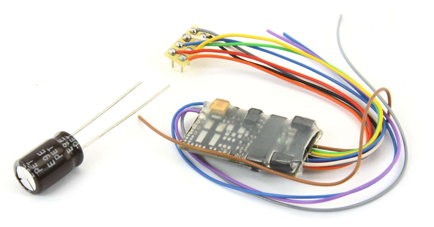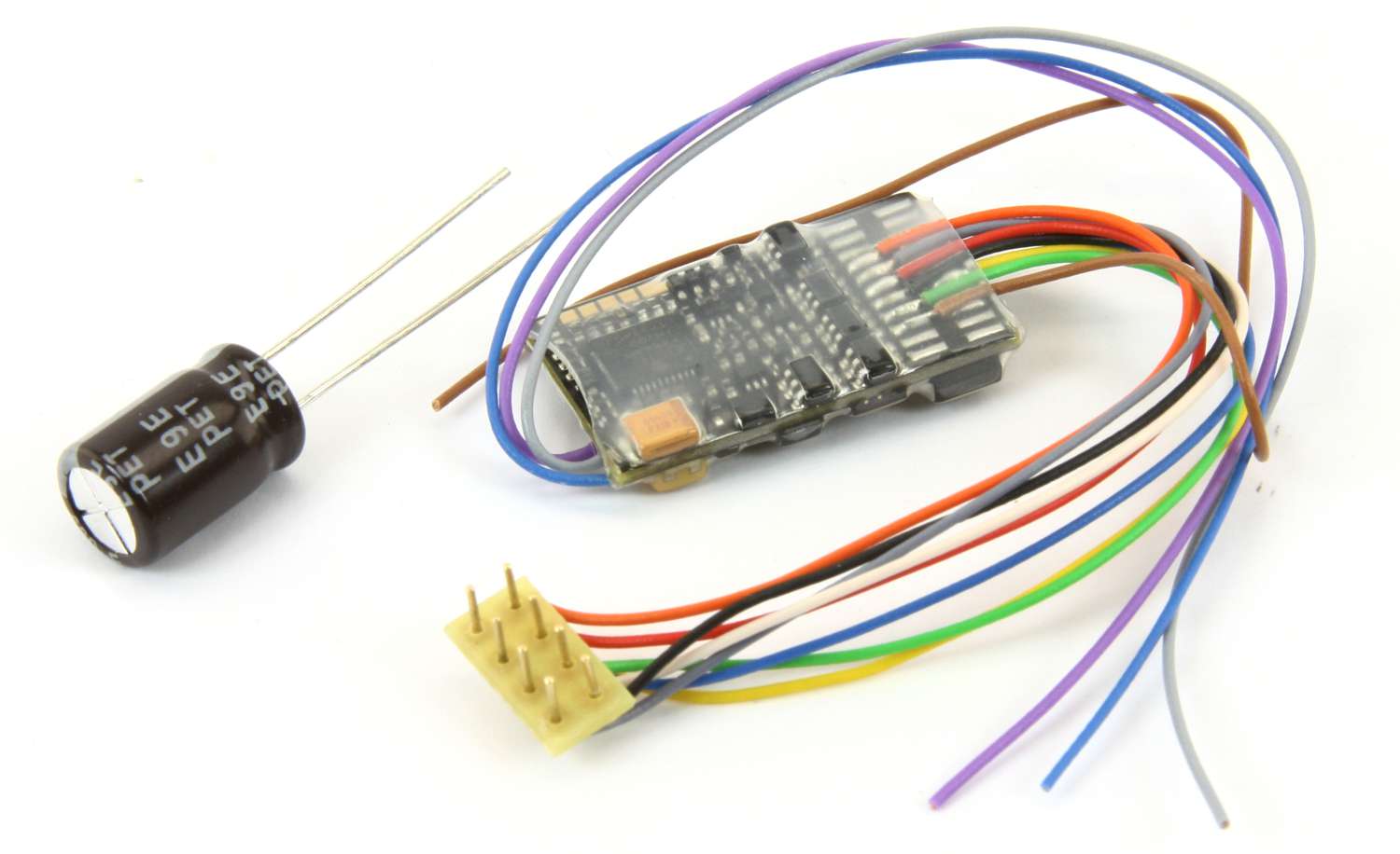 Decoder 26 x 15 x 3,5 mm, 1,8 A, Spitzenstrom 2,5 A, NEM 652 an Drähten, 10 Funktionsausgänge (Summe bis 0,8 A)