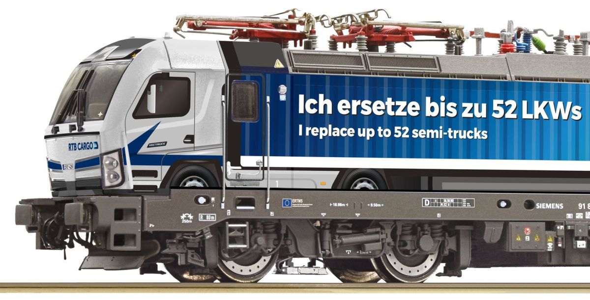 Das TT-Modell zeigt den Vectron 193 429 von ELL / RTB Cargo in ihrer spektakulären Sonderlackierung – gestaltet im Stil eines modernen Lkw. Unter dem Motto „Ich ersetze bis zu 52 Sattelschlepper“ setzt die Lok ein starkes Zeichen für nachhaltigen Gütertransport auf der Schiene.