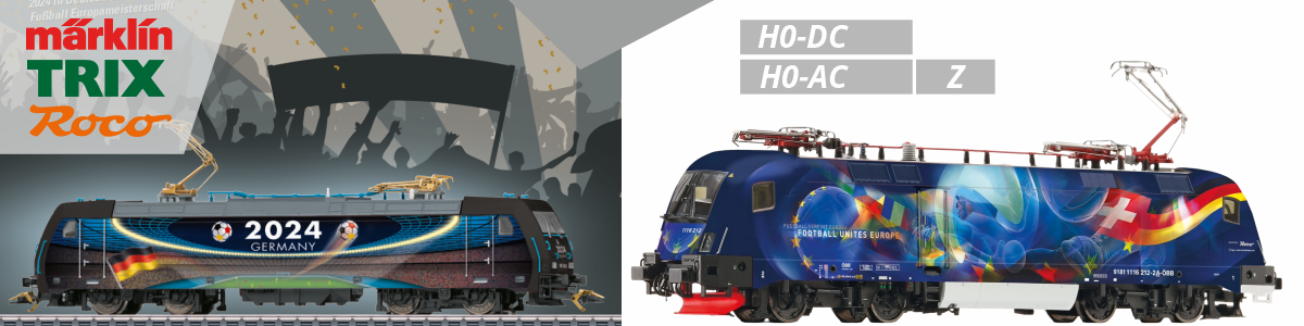 Die Sondermodelle zur EM 2024 von Roco, Märklin und Trix sind alle werkseitig ausverkauft und werden jetzt ausgeliefert. Die ersten beiden Modelle sind seit 28.05.2024 am Lager.