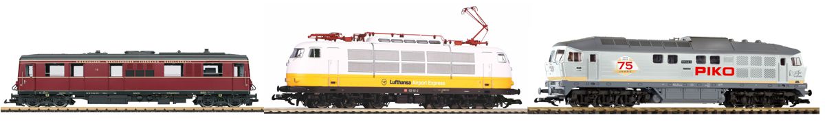 Dazu zählen das analoge Piko Startset 37145 mit einer V100 und zwei Rekowagen der DR (Epoche III, inklusive RC-Control) sowie das LGB Startset 90463 mit Dampflok und zwei Flachwagen. Wer direkt in den Digitalbetrieb einsteigen möchte, findet mit dem digitalen Funk-Startset von Piko (35000-10-37-38-A24) eine komfortable Lösung.