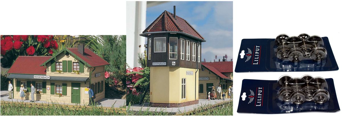 Auch im Bereich Gebäude und Ausstattungen bieten wir viele interessante Artikel von Pola und Piko an. Darüber hinaus haben wir ausgewählte Lokomotiven und Wagen nochmals im Preis reduziert. Zu den Highlights gehören unter anderem die beliebten Klassiker wie der Bahnhof „Rosenbach“ (Piko 62040) und das Stellwerk „Rosenbach“ (Piko 62041) sowie die bewährten Liliput Radsätze 999300 und 999304.