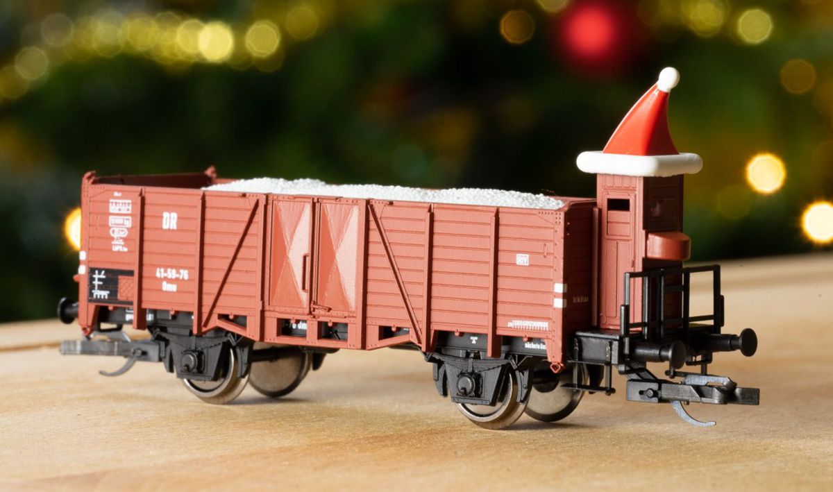 Offener Güterwagen Omu (ex. Königsberg) mit Bremserhaus, DR, Ep.III "Weihnachtswagen" mit Weihnachtsmütze und Schneeladung