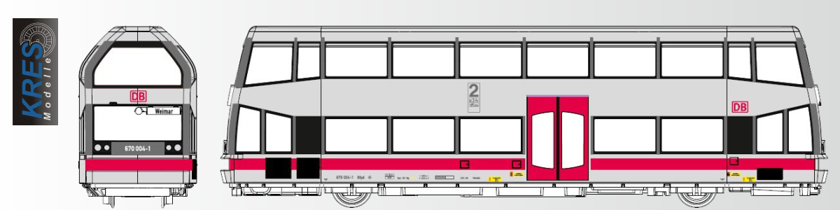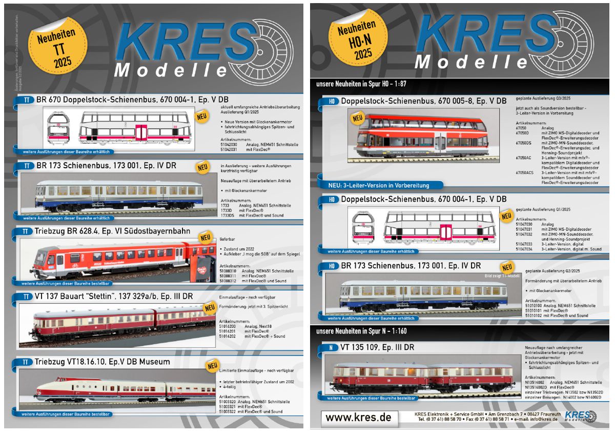 → Es gilt: „Nur solange der Vorrat bei Kres reicht!“ - Neue Artikel: Doppelstock-Schienenbus BR 670 als 670 004-1 und 670 005-8 in fünf technischen Varianten. Ergänzung: DC-Sound und AC-Sound beim Artikel 67020 „Köstner“, alle Artikel 1:87 (H0).