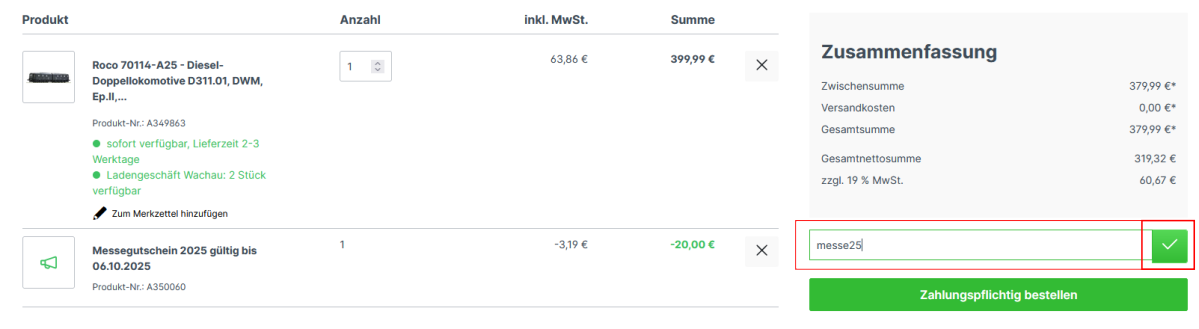 Nutzen Sie unseren Gutscheincode messe25 und erhalten damit 5 % Rabatt auf alle lieferbaren Artikel. Der Gutscheincode ist bis zum 06.10.2025 aktiv.