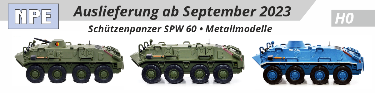 Vorbild: Im Zeitraum von 1967 bis 1983 beschaffte die NVA den Schützenpanzerwagen SPW 60 PM. Das Fahrzeug stellte das Hauptkampfmittel der motorisierten Schützen und hatte eine Vielzahl von Eigenschaften und Einsatzgebieten. Zum einen wurde es genutzt um Schützen zu transportieren (10 Mann Besatzung), zum anderen war es schwimmfähig, konnte unterschiedlich bewaffnet werden und wurde zahlreich umgebaut für verschiedene Nutzungszwecke (Kommandofahrzeug, Propagandafahrzeug, Funkübertragung). Darüber hinaus war es in allen Truppen des ehemaligen Ostblocks im Einsatz und ist es teilweise noch heute. Das NPE-Modell wird in verschiedenen Ausführungen angeboten, u.a. auch mit und ohne Turm.