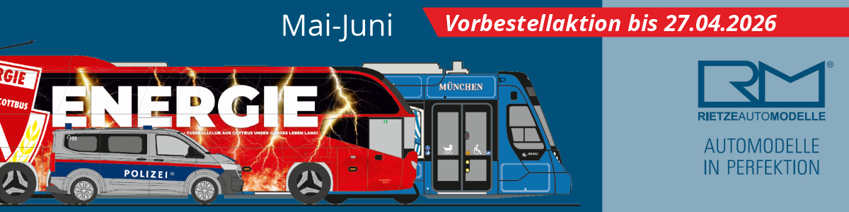 Die Rietze Neuheiten für Mai und Juni 2026 bieten wieder eine gelungene Mischung aus aktuellen Einsatzfahrzeugen, modernen Busmodellen und interessanten Sonderlackierungen.