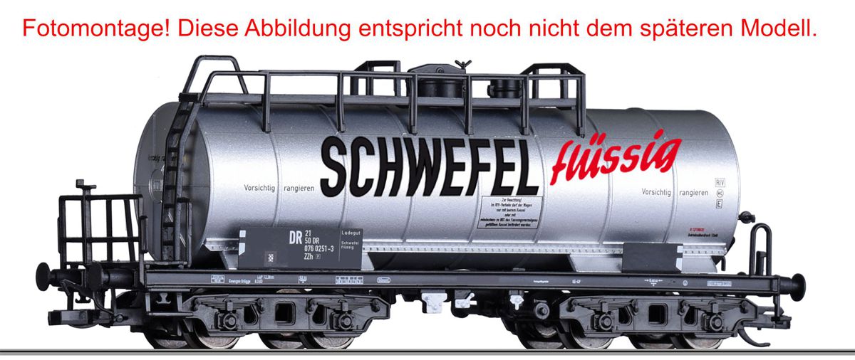 Kesselwagen sind bei der Modellbahnkundschaft recht beliebt und es gibt schon sehr viele Modelle von verschiedenen Herstellern. Trotzdem ist es uns gelungen, ein ganz besonderes Vorbild zu finden. Der Kesselwagen ZZh der Deutschen Reichsbahn fällt durch einen sehr großen und prägnanten Schriftzug auf. Auf einigen Bildern sehen diese Schwefel-Wagen durch den täglichen Einsatz gelblich und stark verschmutzt aus. Wir stellen diesen Wagen im Auslieferungszustand dar. Der silberne Kessel und die Beschriftung sind noch sauber und gut zu erkennen.