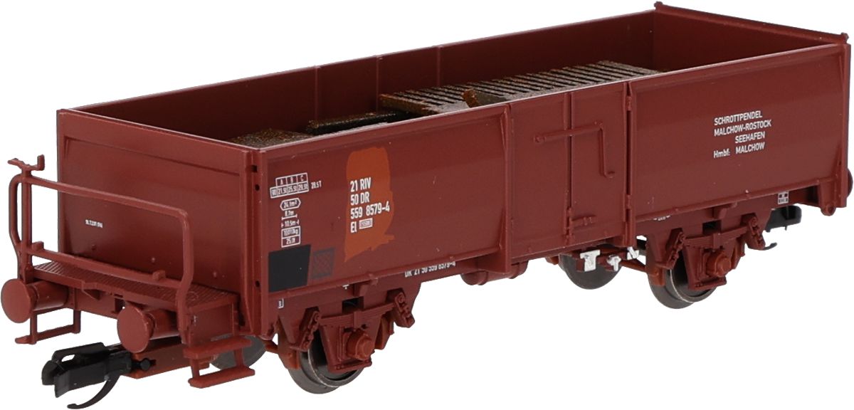 - Wagen 3: Offener Güterwagen El 5598 (ex. DB), 50 DR 559 8579-4, mit Bremserbühne, anderer Braunton als Wagen 1 und 2.