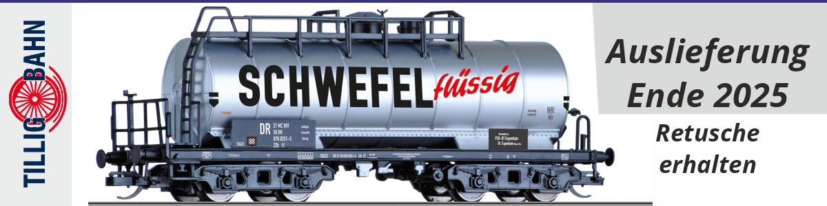 Bei diesem Modell gibt es Neuigkeiten. Der Liefertermin wurde uns nun von Tillig für Dezember 2025 bestätigt. Die Produktionsmenge wurde bereits vor einigen Wochen auf 320 Stück festgelegt, davon sind bereits ca. 86 % (Stand 19.08.2025) vorbestellt. Außerdem erhielten wir von Tillig eine aktuelle Retusche. Dort sieht man nun die Anschriften sehr gut, allerdings ist der Hauptschriftzug nur gerade auf den Kessel platziert. Beim Modell passt sich der Schriftzug natürlich der Wölbung an.