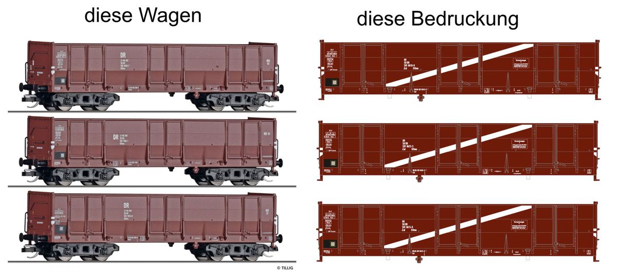 - Tillig 502542 - 3er Set offene Güterwagen Eal (OOmu) als Versuchswagen mit weißen Streifen, DR, Ep.IV