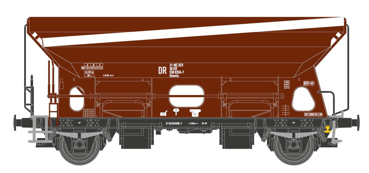 - Tillig 502528 - Selbstentladewagen Ommtu als Versuchswagen mit weißen Streifen und Ladung, DR, Ep.IVa