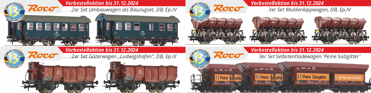 Kurz vor Jahresende veröffentlichen wir vier weitere w13plus-Exklusivsets von Roco. Diese attraktiven Wagensets werden 2025 ausgeliefert und können ab sofort vorbestellt werden. Nutzen Sie dazu unsere Vorbestellaktion bis 31.12.2024!