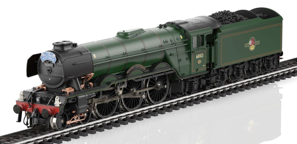 Der "Flying Scotsman" war eine Dampflok, die seit 1924 bei der London and North Eastern Railway im Einsatz war. Er wurde von Nigel Gresley entwickelt und erlangte durch seinen klangvollen Namen schnell Bekanntheit. Die Lok erreichte 1928 einen Rekord, als sie ohne Zwischenstopp die 632 km lange Strecke zwischen London und Edinburgh bewältigte. 1934 erreichte sie als erste Dampflok Großbritanniens eine Geschwindigkeit von 160,9 km/h. Während des Zweiten Weltkriegs musste sie ihr grünes Farbkleid gegen Schwarz tauschen, erhielt es aber später zurück. Nach mehreren Besitzerwechseln kaufte das National Railway Museum in York die Lok 2004 und restaurierte sie bis 2016 komplett. 2023 feiert der "Flying Scotsman" sein 100-jähriges Jubiläum und wird das H0-Sortiment von Märklin und Trix schmücken.