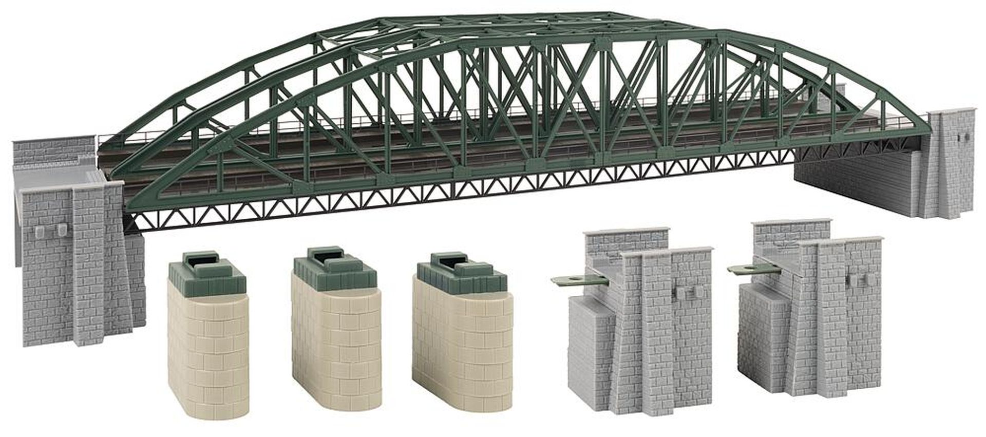 Maße: 662 x 164 x 152 mm<br />Majestätisch thront die Bogenbrücke über der Miniaturlandschaft. Ob eingleisig hintereinander oder zweigleisig nebeneinander gebaut, so oder so ist sie ein echter Hingucker. Der Bausatz enthält Brückenköpfe und Pfeiler und die Durchfahrtshöhe beträgt 51 mm. <br />Dieser Bausatz enthält: 162 Einzelteile in 4 Farben und 1 Bauanleitung.