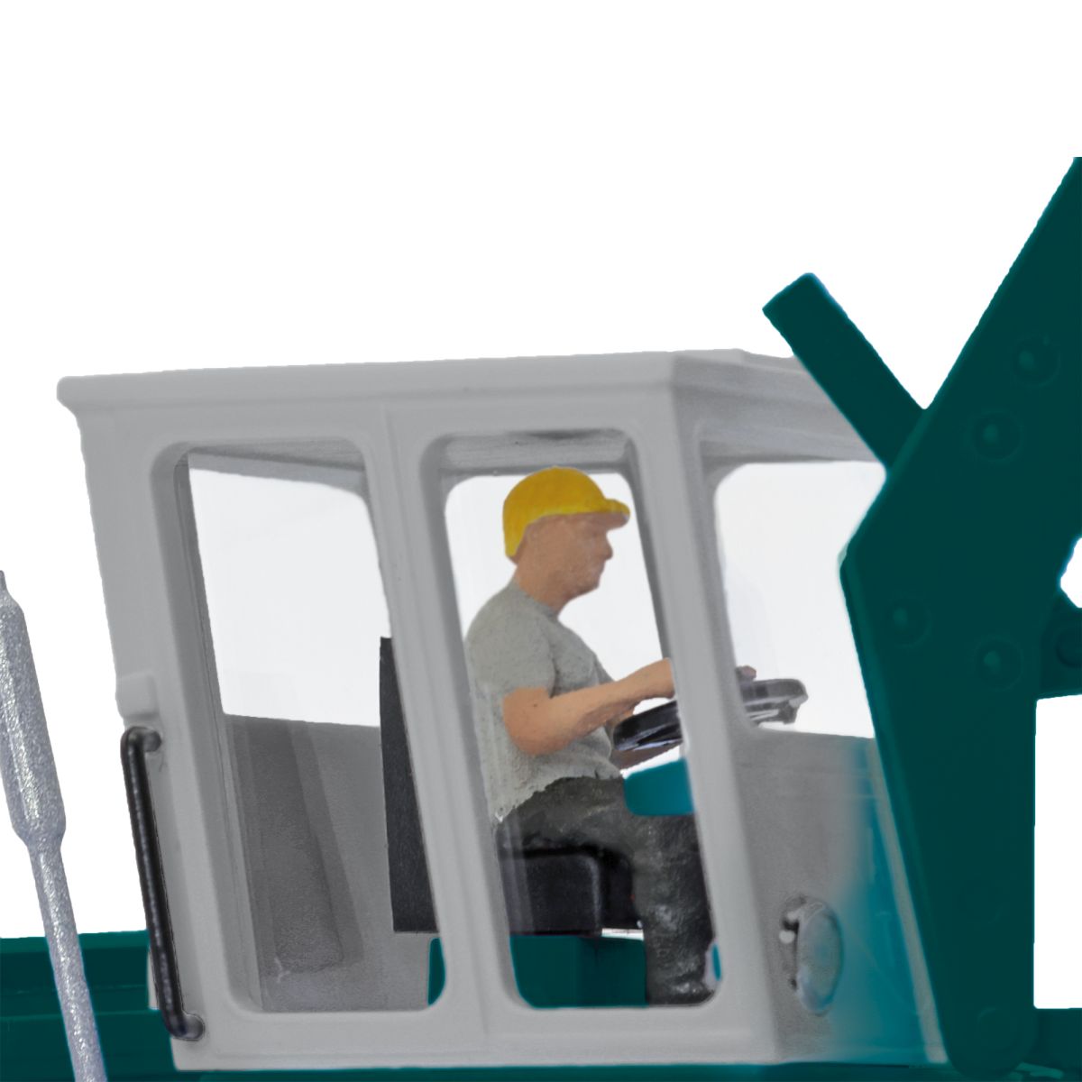 Blaugrüner Schlepper Mobilkran TIH 445 ausgerüstet mit Lasthaken. Der robuste Alleskönner transportiert ein Betonrohr und hat sogar eine Fahrerfigur mit Schutzhelm im Innern des Fahrerhauses. Die voll funktionsfähige und bewegliche Miniatur lässt keine Wünsche offen und bereichert durch ihre vielen liebevollen Details jede Modellsammlung.