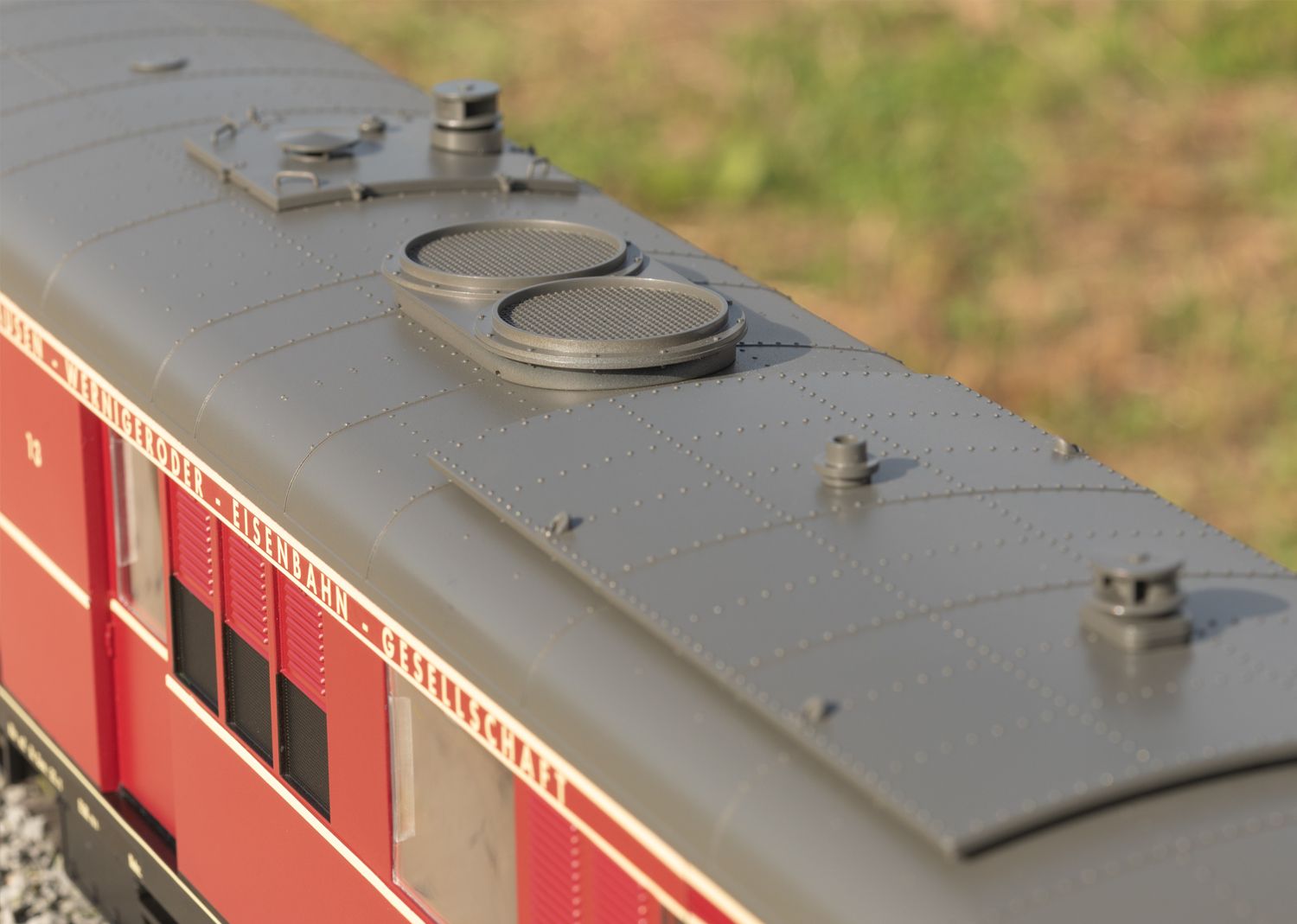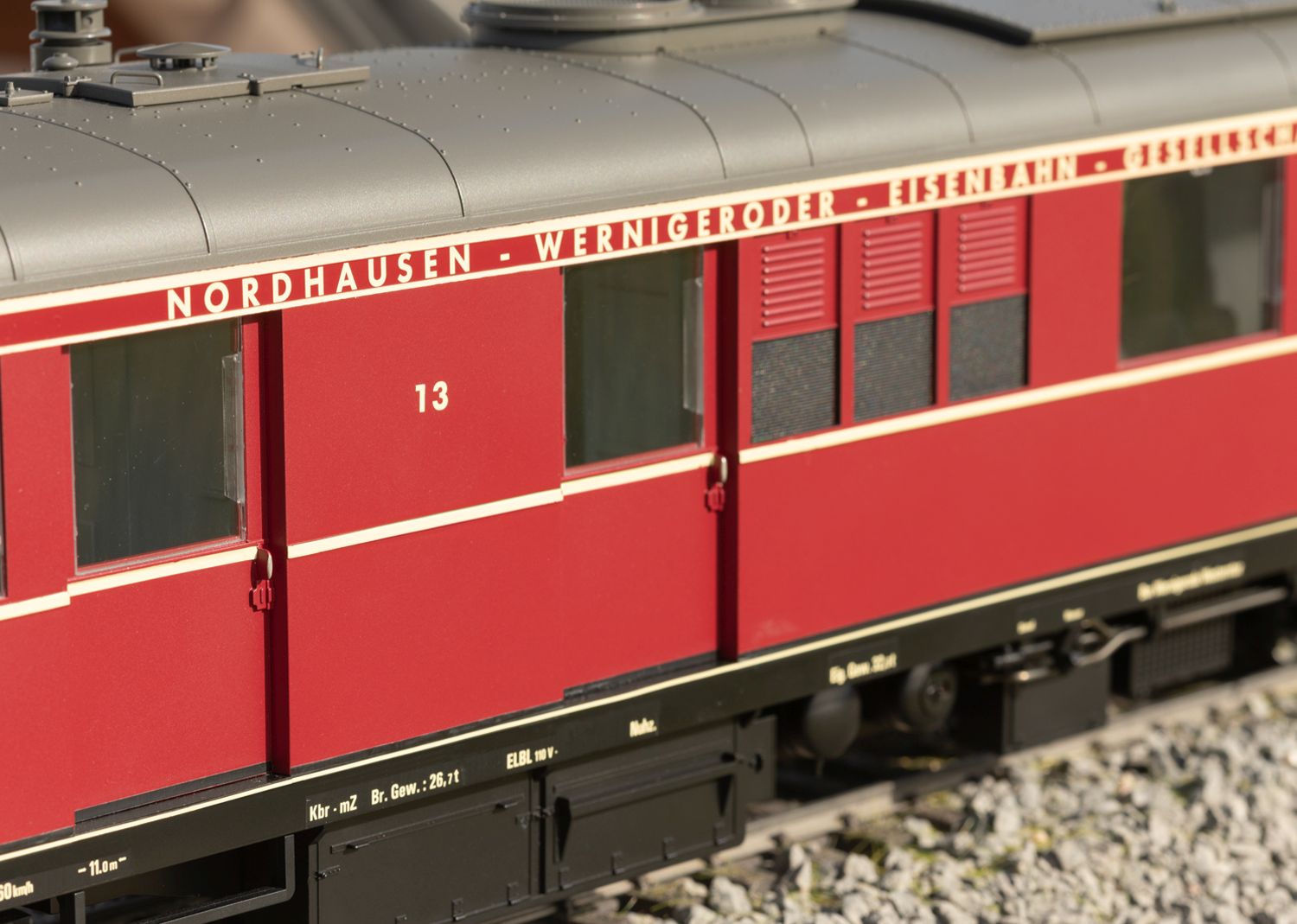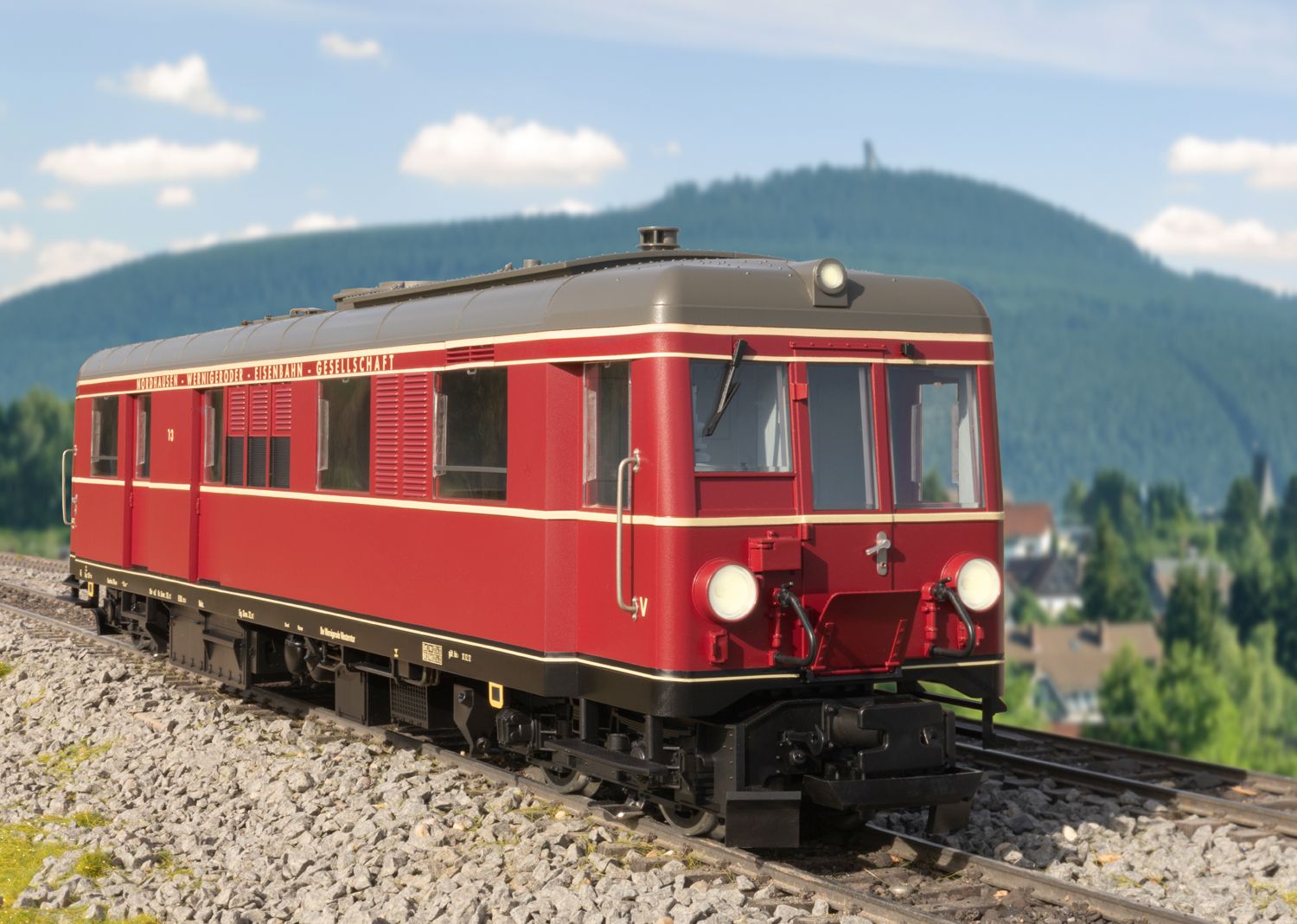 Modell des Dieseltriebwagens T3, wie er heute noch bei der HSB vorhanden ist. Originalgetreue rote Farbgebung und Beschriftung der Epoche VI. Vier Radsätze von zwei leistungsstarken kugelgelagerten Bühler-Motoren angetrieben. Dadurch ist der sehr zugkräftige Triebwagen in der Neukonstruktion Lage – so wie sein großes Vorbild – auch mehrere Wagen zu ziehen. Ausgerüstet mit einem mfx/DCC-Decoder mit vielen Licht- und Soundfunktionen. Innenbeleuchtung und Führerstandsbeleuchtung, im Digitalbetrieb schaltbar.