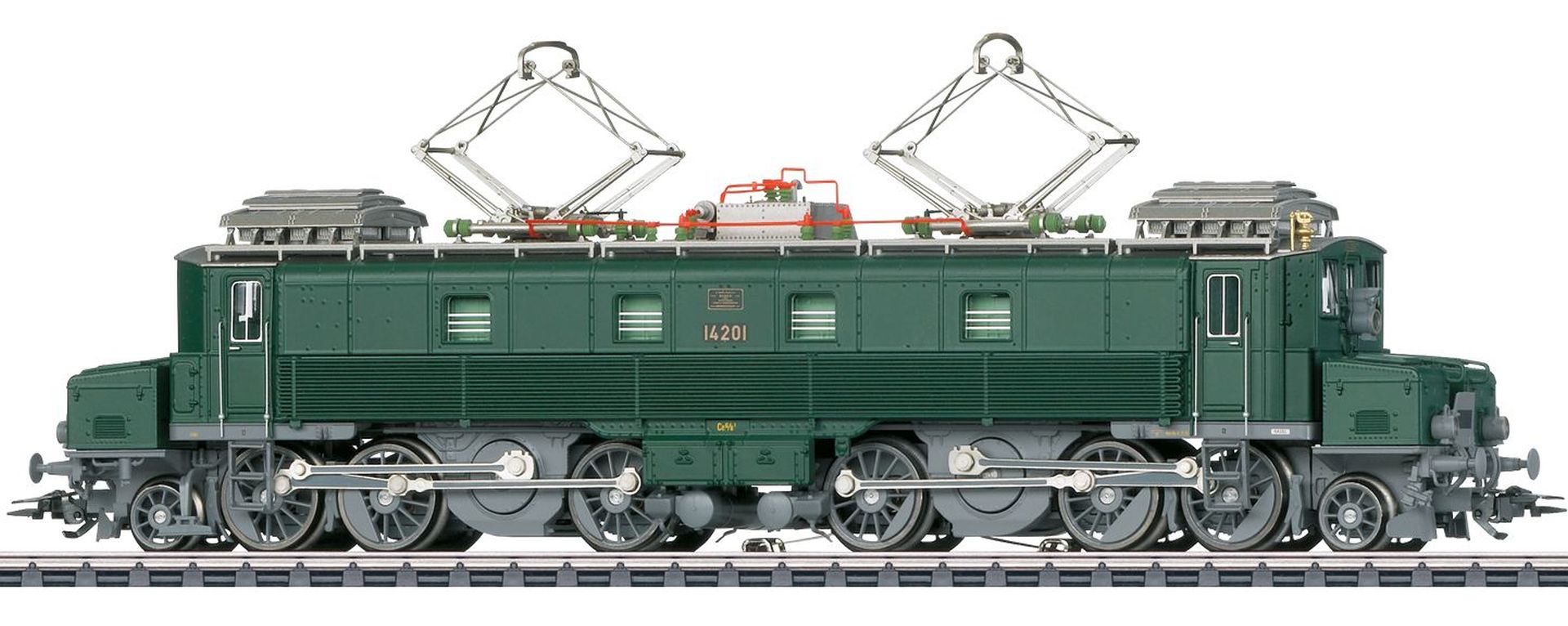 Vorbild: Güterzug-Elektrolokomotive Serie Ce 6/8 I „Köfferli“ der Schweizerischen Bundesbahnen (SBB). Tannengrüne Grundfarbgebung mit grauem Fahrwerk. Stirnseitige Führerstandstüren mit Fenster und mit Übergangsblechen, mit Besandungsanlage, mit Falschfahrsignal und mit Integra-Signum Magnete. Lok-Betriebsnummer 14201. Betriebszustand Anfang der 1950er-Jahre.