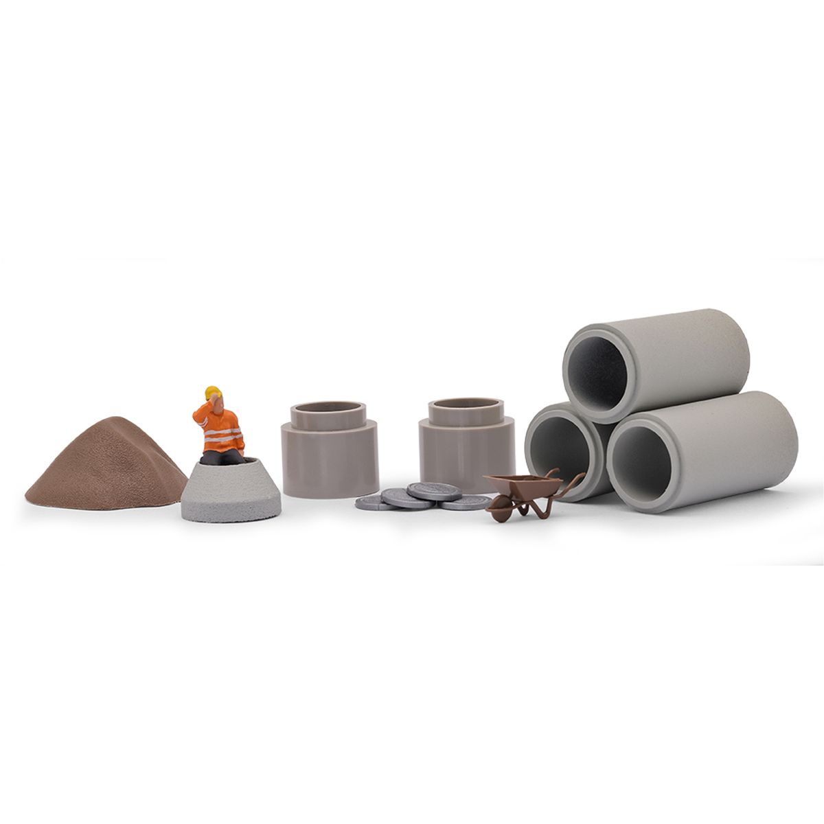 Mit Schachthälsen und Rohren kennt er sich aus! Action Set mit Bauarbeiter, Schachthals, Rohren in verschiedenen Längen, Kanaldeckeln, Schubkarren, Sandhaufen und Werkzeug.
