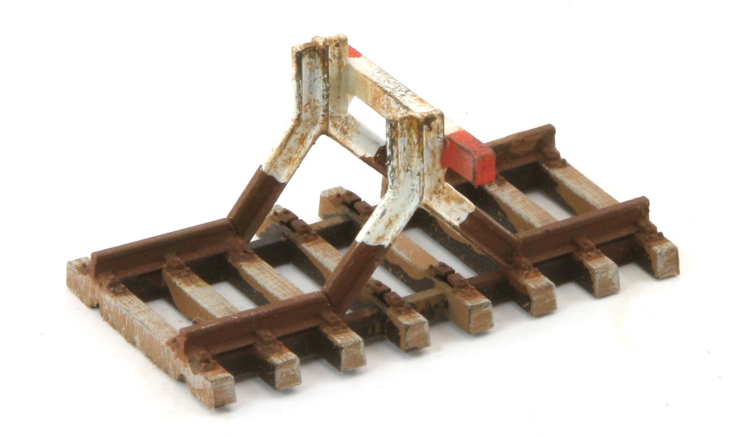 Prellbock mit einer rot-weißen Pufferbohle, patiniert - hochweriges und gealtertes Fertigmodell, Basis Tillig Elite, Profilhöhe 2,07 mm