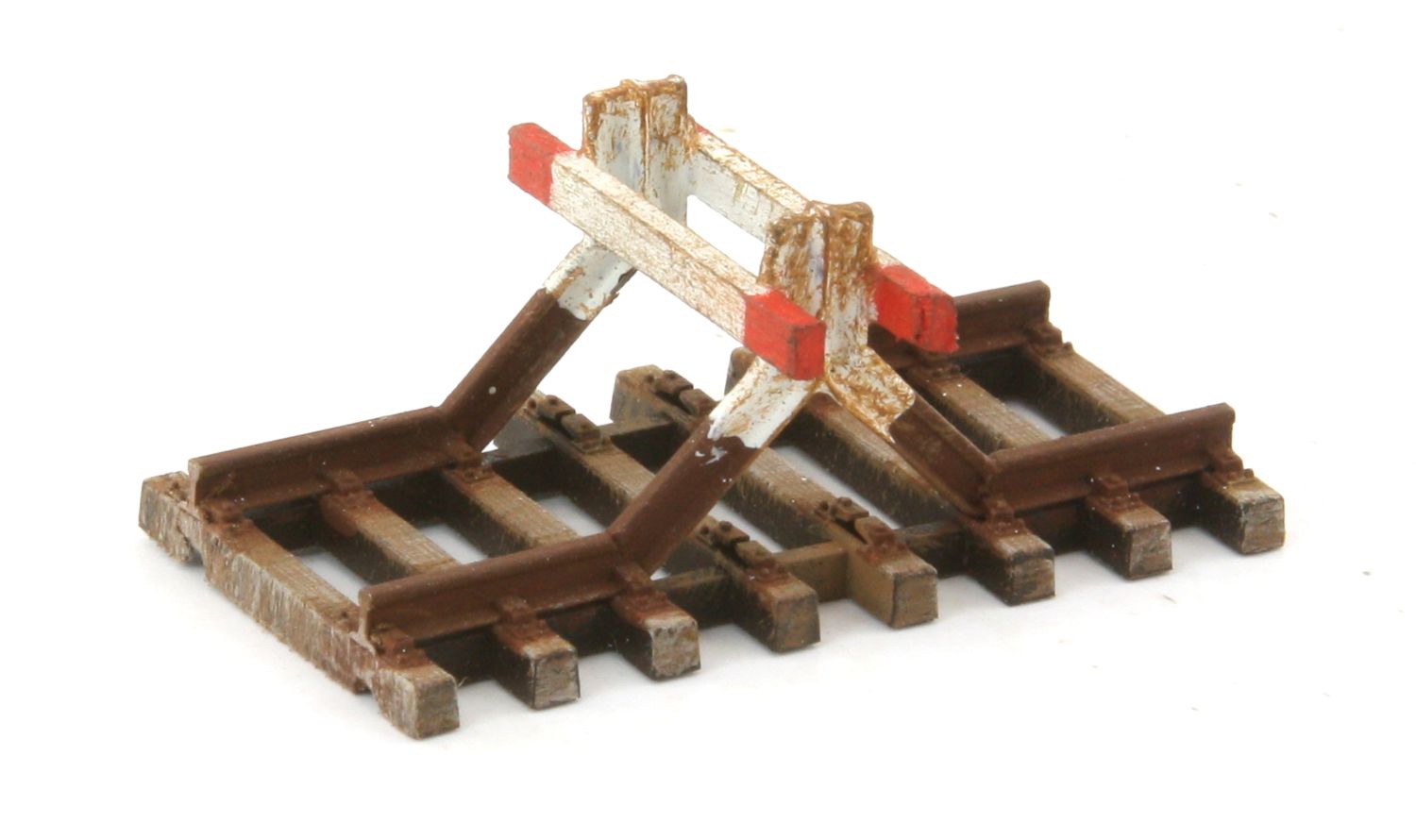 Prellbock mit zwei rot-weißen Pufferbohlen, patiniert - hochweriges und gealtertes Fertigmodell, Basis Tillig Elite, Profilhöhe 2,07 mm