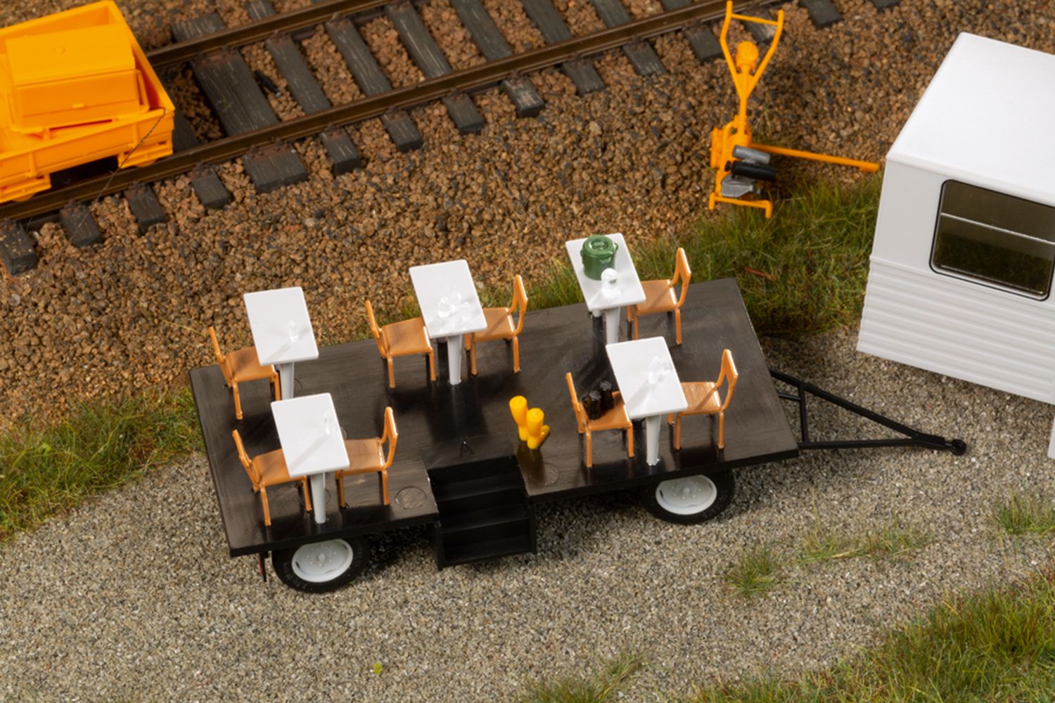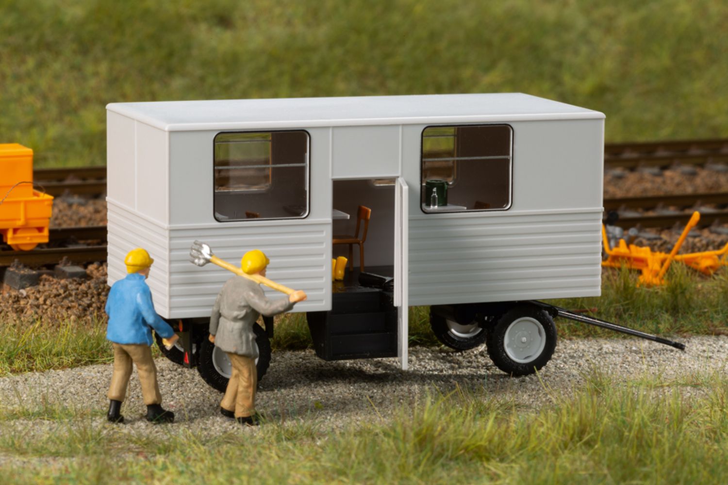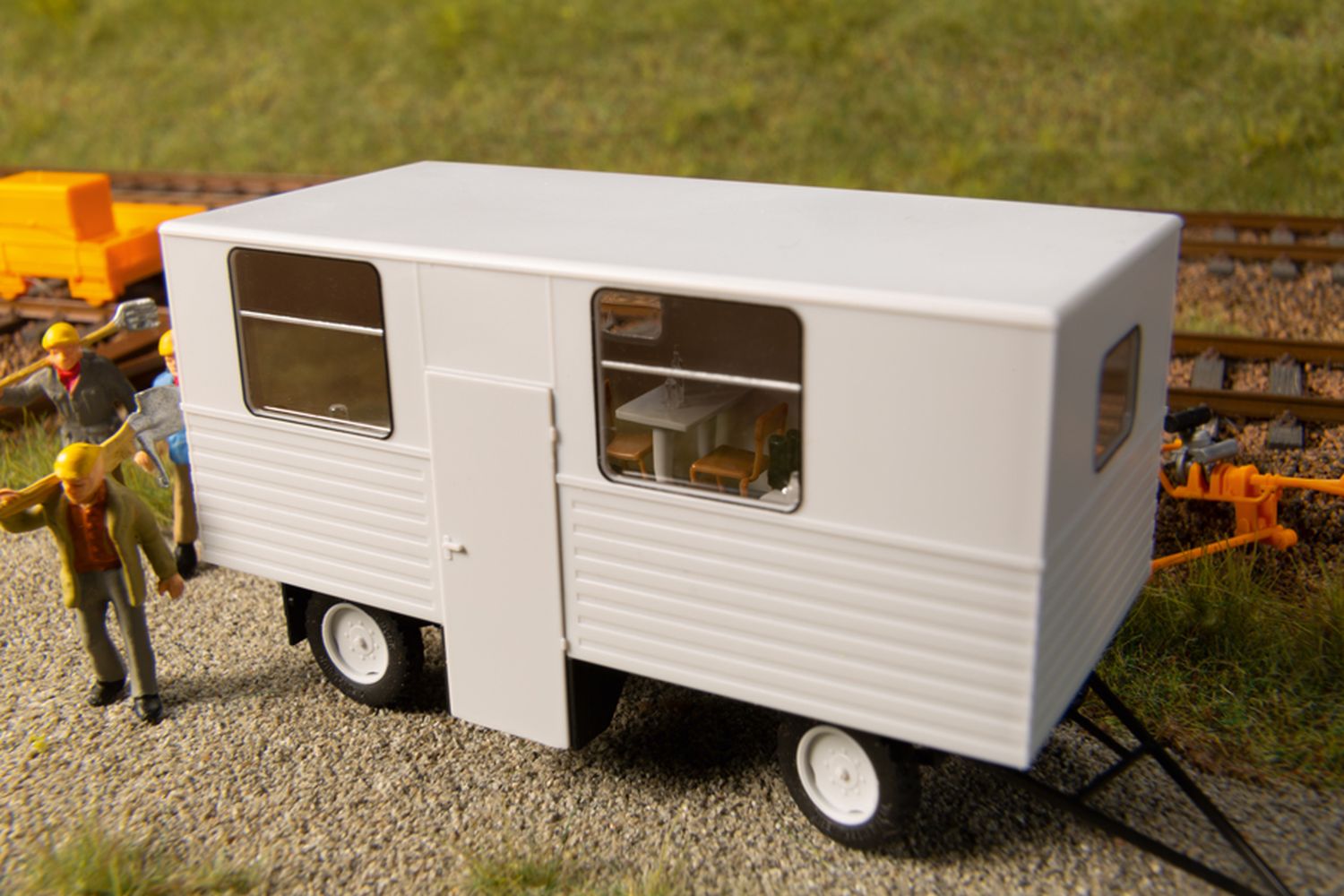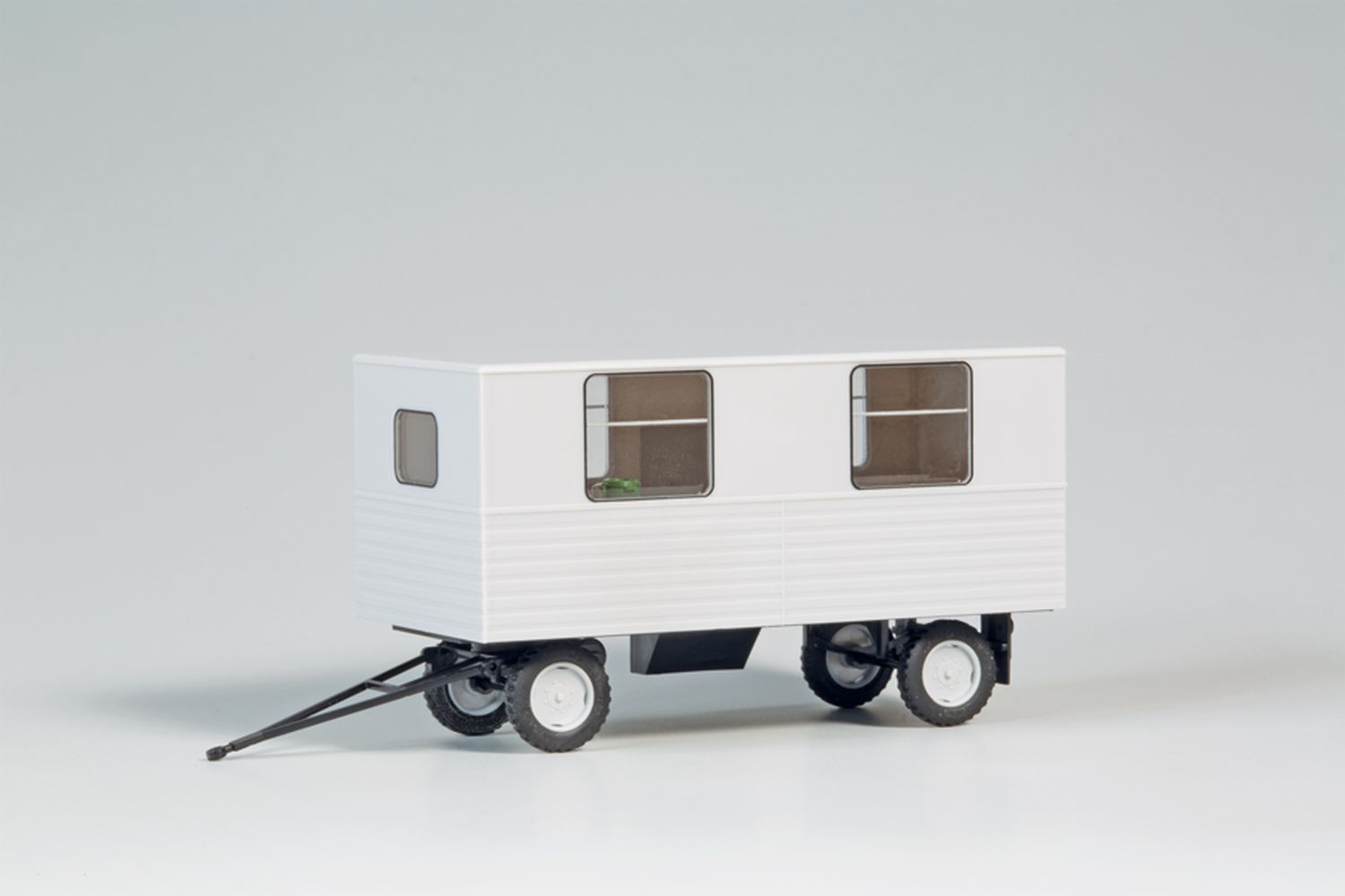 81 x 29 x 35 mm - Bausatz. Fein detailliertes Modell des Aufenthaltsanhänger HL40.43. Das maßstäbliche Fahrzeug zeichnet sich durch bedruckte Rückleuchten, Kennzeichen und Fenstereinfassungen, vorbildgerechte beschriftete Bereifung, offen dargestellte Türen sowie einer authentischen Inneneinrichtung aus. Die Achswellen sind aus geschwärztem Stahl. Rollfähige und lenkbare Neukonstruktion.