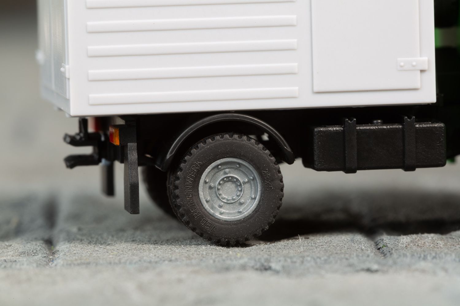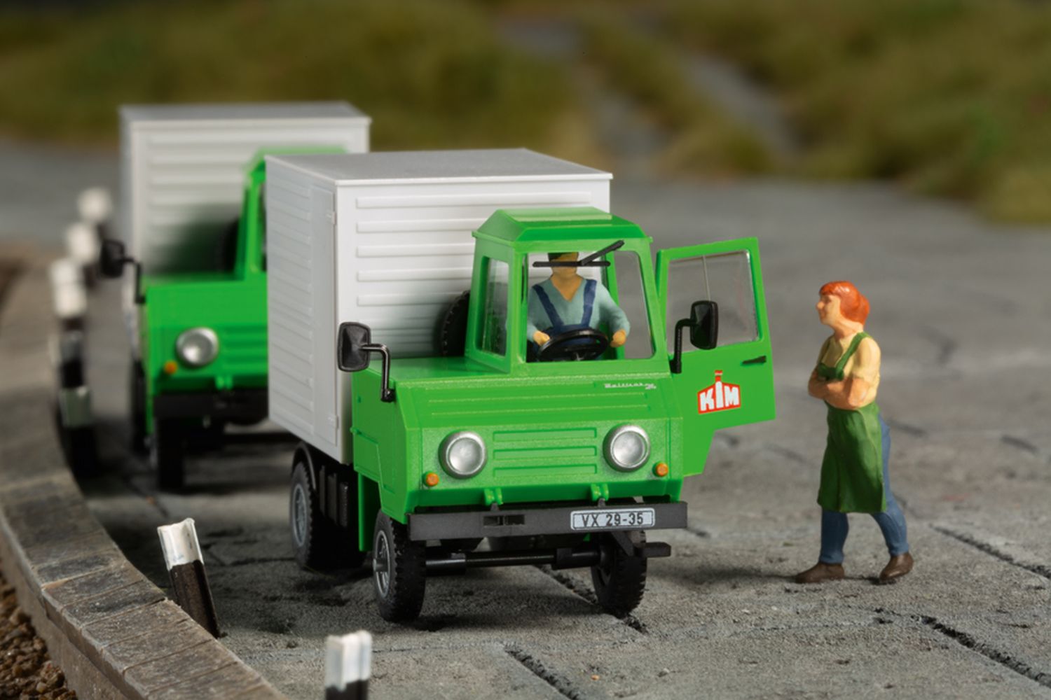 44 x 24 x 27 mm - Bausatz. Fein detailliertes Modell des Multicar M24. Mit Kofferaufbau ist das maßstäbliche Fahrzeug für das "Kombinat Industrielle Mast" (KIM) unterwegs. Das Logo sowie die Lampenzierringe, die Rückleuchten, die Türgriffe und die Kennzeichen sind aufwendig mehrfach bedruckt. Offen darstellbare Türen, eine Motorattrappe, vorbildgerechte beschriftete Bereifung auf korrekt nachgebildeten Felgen und Rollfähigkeit zeichnen das komplett neu konstruierte Modellfahrzeug aus. Die Achswellen sind aus geschwärztem Stahl. Ein Druckbogen mit alternativen Kennzeichen liegt bei. Inklusive sitzender Figur.