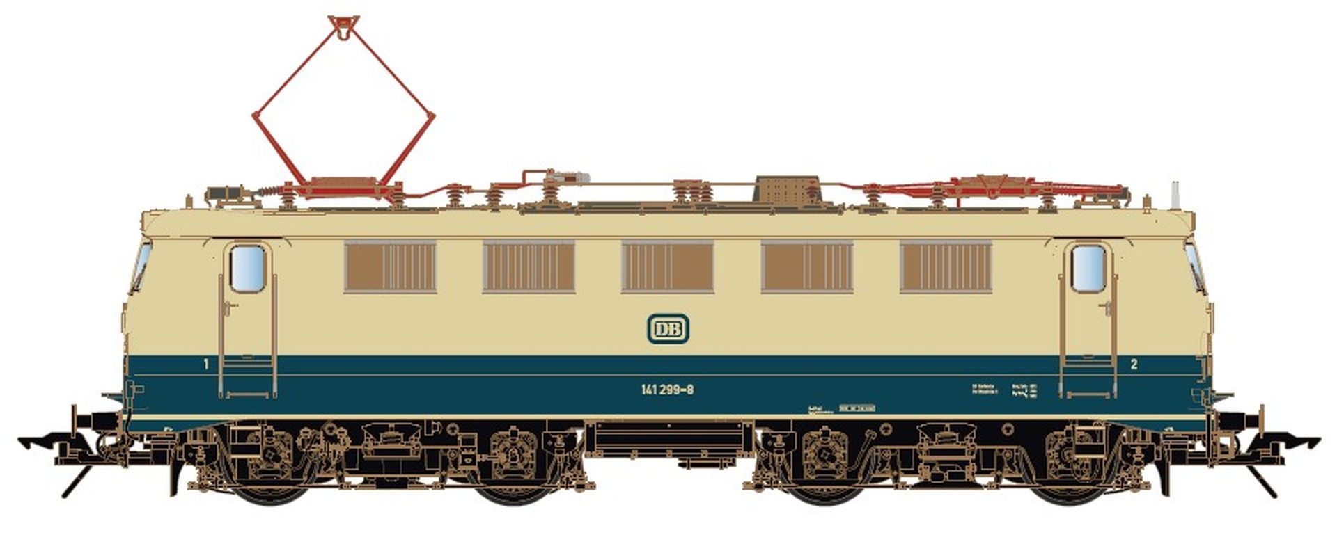 Elektrolok BR 141 299-8, DB, Ep.4, BD Karlsruhe Bw Mannheim 1, ozeanblau/beige, Doppellampen, Regenrinne über Tür und Frontfenstern, senkrechter Haltegriff an der Front, Trittstufe über Puffer, senkrechte Lüftergitter (Klatte-Gitter), UIC-Steckdose neben Haltegriff