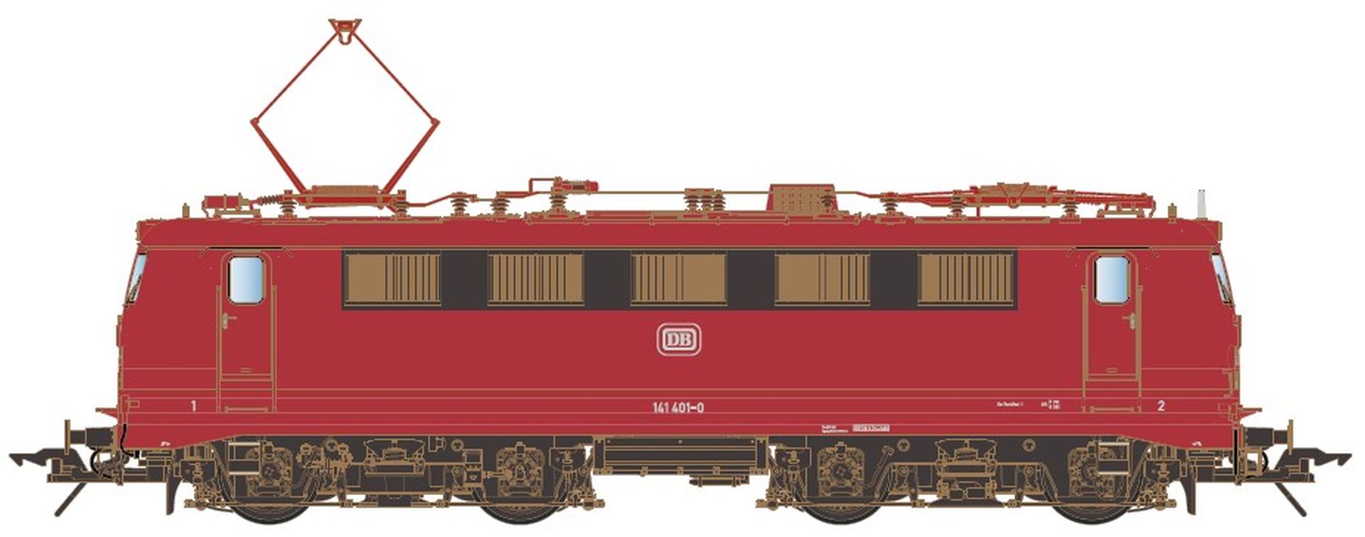 Elektrolok BR 141 401-0, DB, Ep.5a, Bw Frankfurt 1, orientrot RAL 3031, Doppellampen, Regenrinne über Tür und Frontfenstern, senkrechter Haltegriff an der Front, Trittstufe über Puffer, senkrechte Lüftergitter (Klatte-Gitter), UIC-Steckdose neben Haltegriff