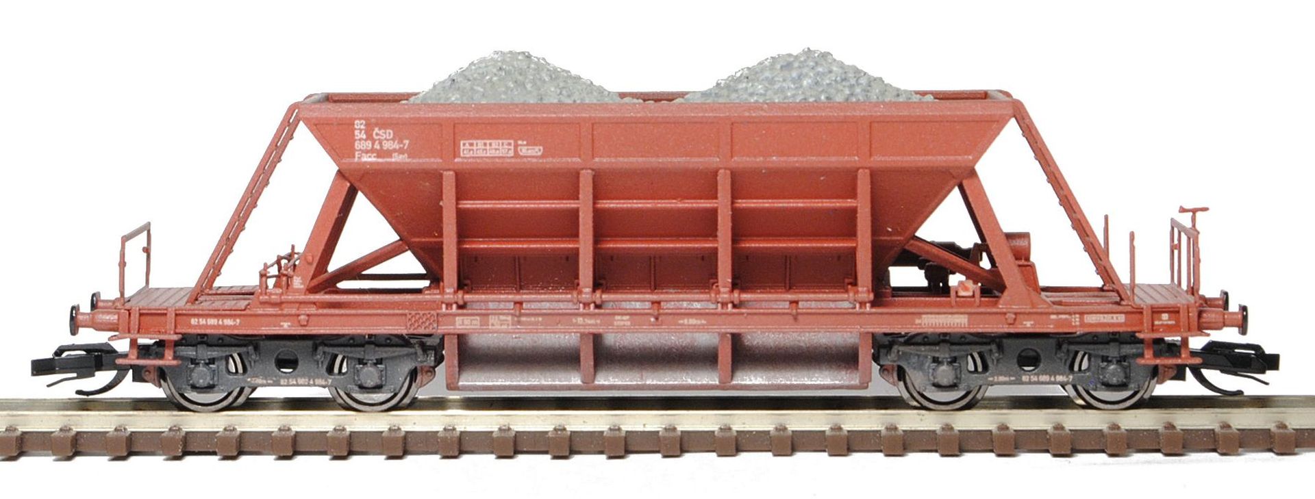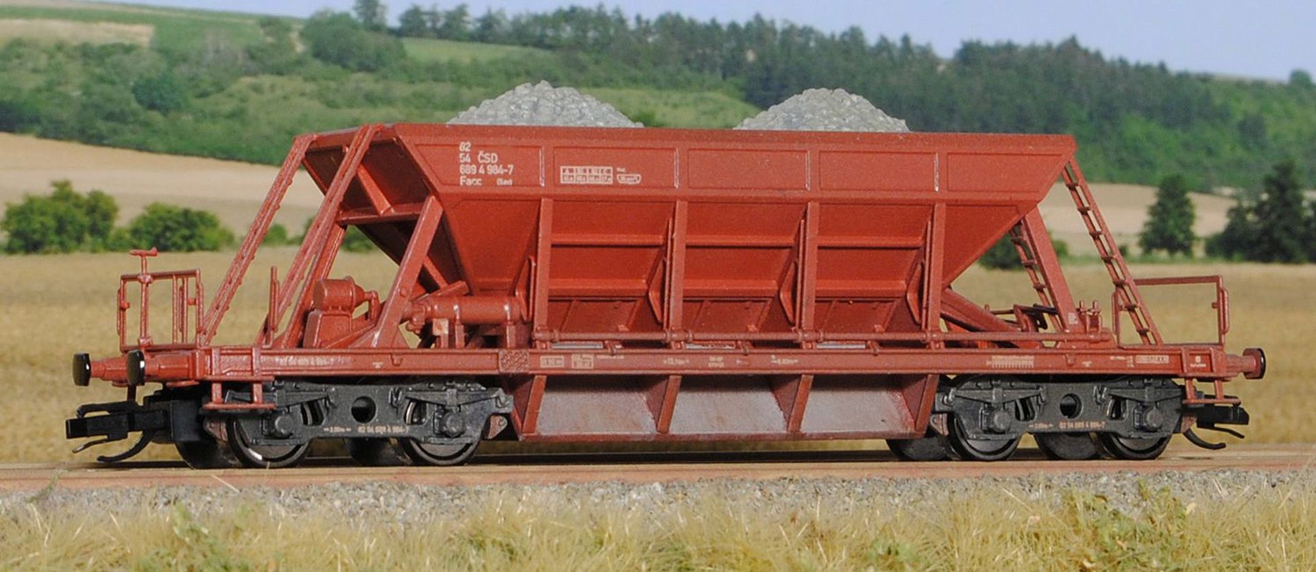 Kompletter Bausatz des offenen Selbstentladewagens. Er enthät Kunststoffteile für Bau des Modells einschließlich Kurzkupplungskinematik, Kupplungen, Metallradsätze in höchster Qualität, Ätzteile, Gewicht und Abziehbilder. Betreiber: CSD, Epoche: III-IV.