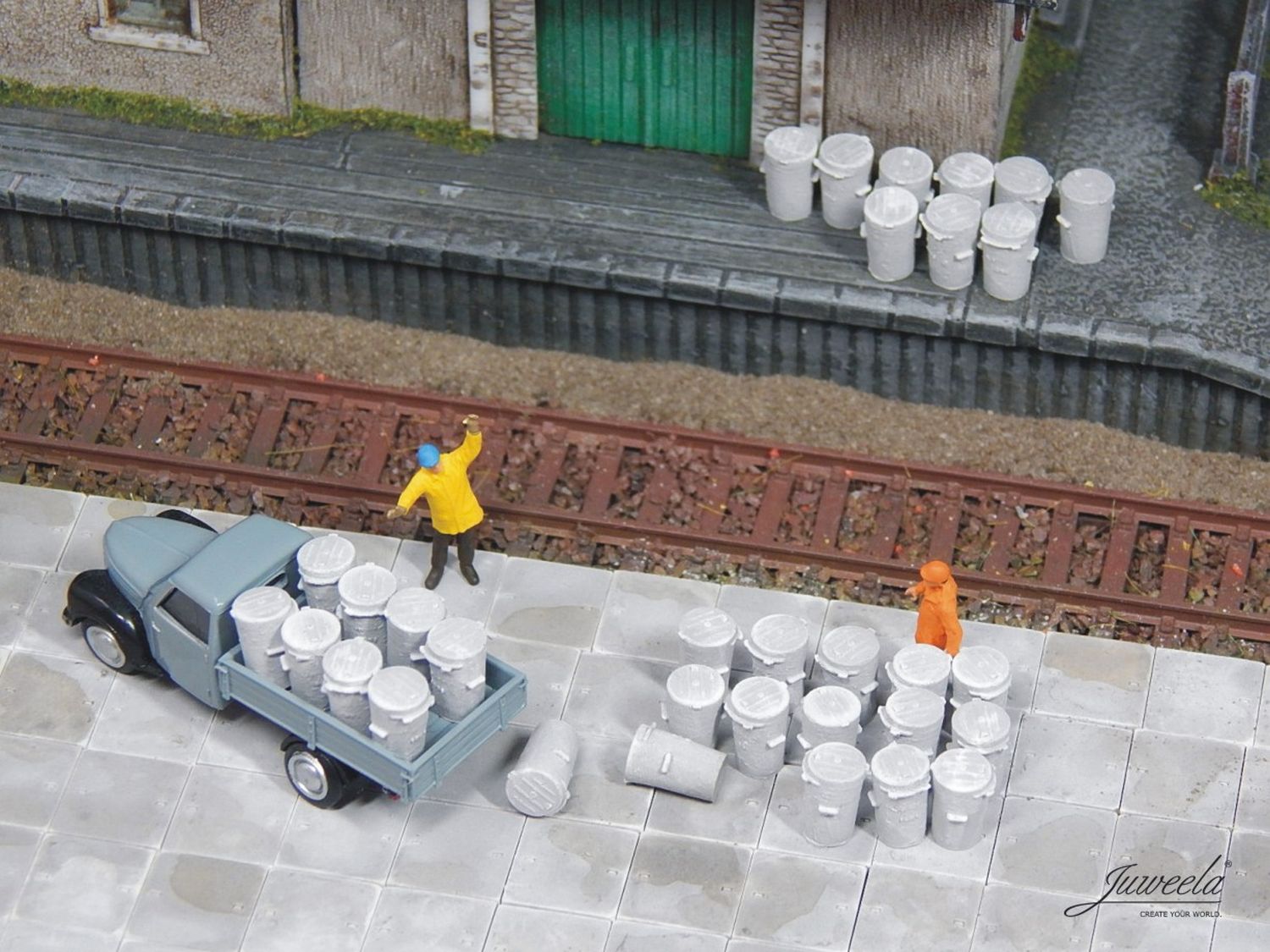 Abfalltonnen aus Zinkblech wie sie in Epoche 2 bis 3 "an jeder Straßenecke" zu finden waren - und natürlich auch auf dem TT Diorama.