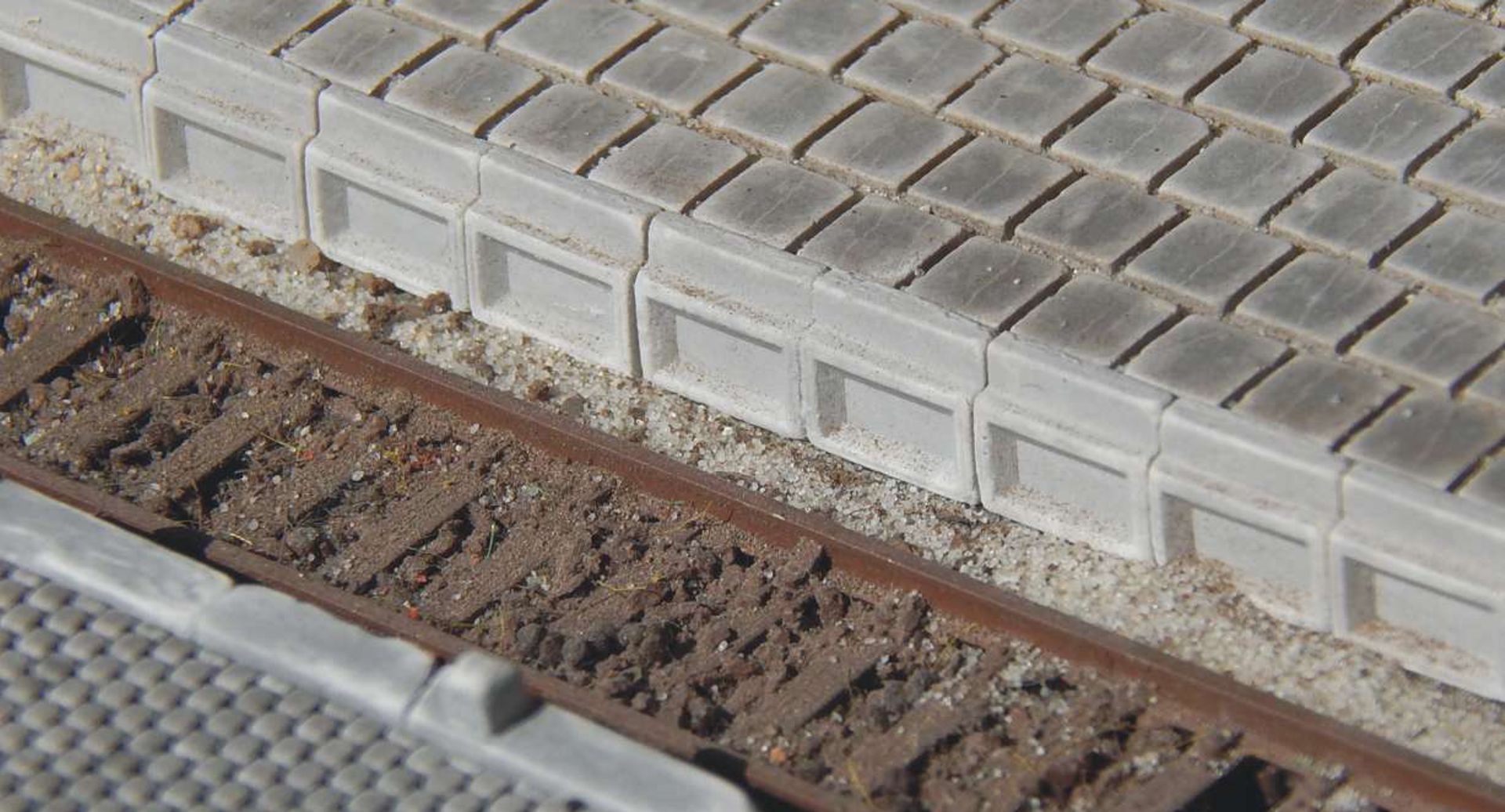Die Bahnsteigkanten werden als Verblender eingesetzt. So läßt sich schnell und einfach ein optisch reizvoller Bahnsteig-Bereich und Hingucker im Diorama darstellen. Im Vorbild sind es Bahnsteigkanten 55 cm ü. SO, die den gleisseitigen Abschluß des Bahnsteiges darstellen.