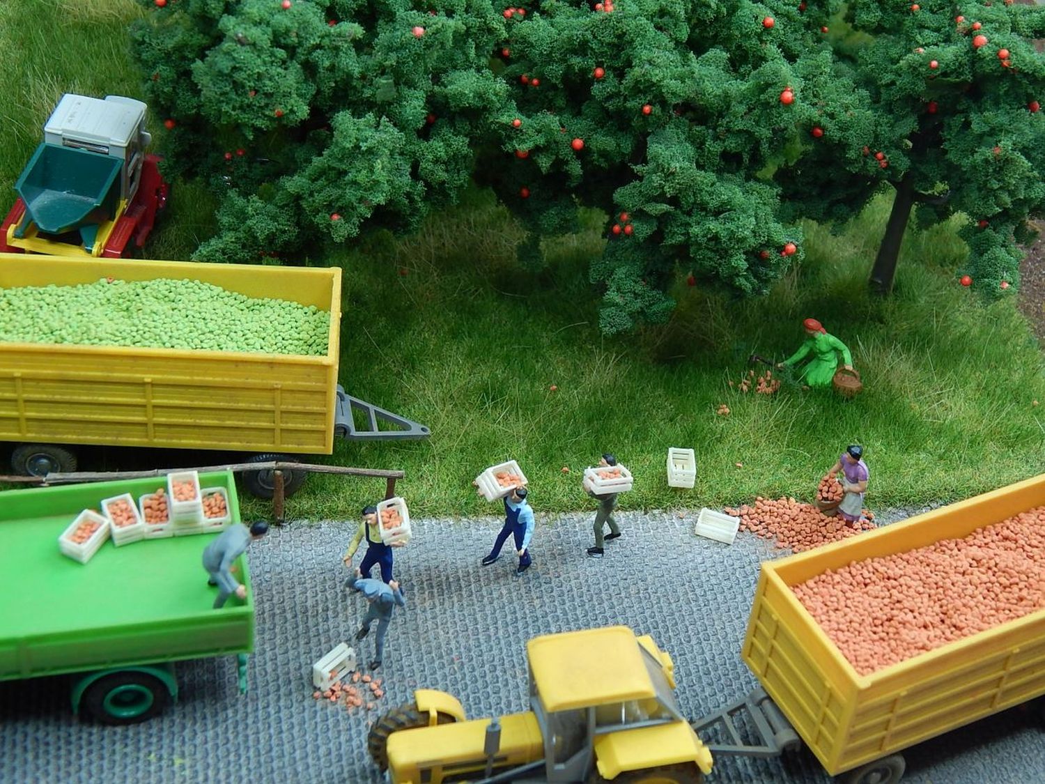 Hmm, Baumobst ist lecker - und viele davon kommen auf einen Wagen: z.B. auf den Erntewagen, denn z.B. Äpfel wurden auch mit der Eisenbahn transportiert. Natürlich kullern sie auch gerne über das Diorama.