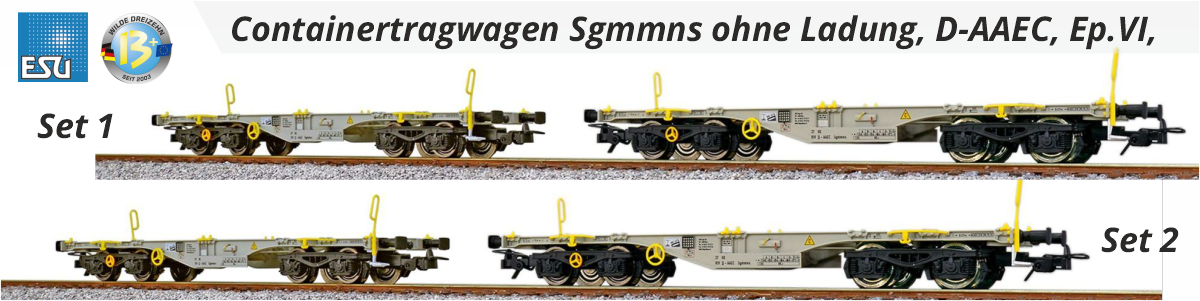 Im Rahmen der aktuellen ESU-Neuheiten, bei denen der Containertragwagen Sgmmns im Fokus steht, werden zwei exklusive Sets ohne Container zu einem attraktiven Preis mit zusätzlichen Betriebsnummern aufgelegt.