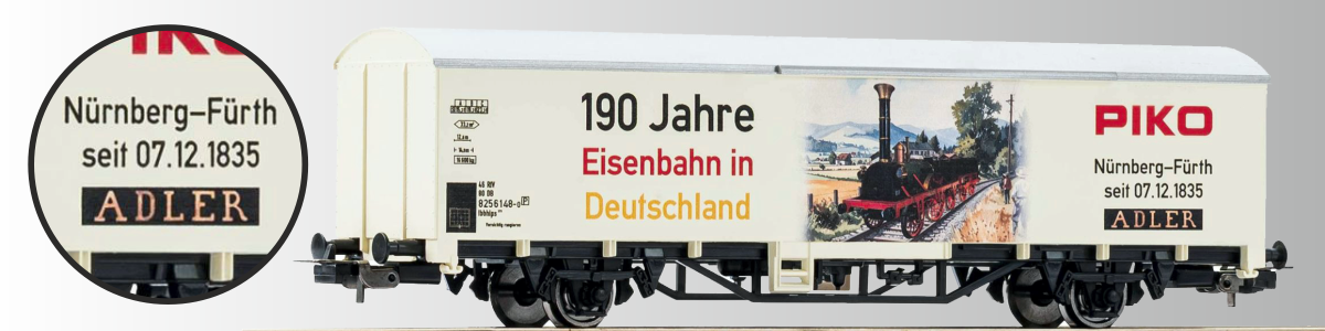 Der exklusive PIKO-Sonderwagen zum „Tag der Modellbahn“ 2025 erinnert an die erste deutsche Eisenbahnlinie zwischen Fürth und Nürnberg – und damit an 190 Jahre Eisenbahngeschichte in Deutschland.