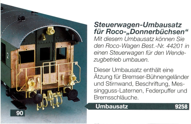 Um einen Roco-Wagen 44201 in einen Steuerwagen für den Wendezugbetrieb umzubauen. Enthält eine Ätzung für Bremser-Bühnengeländer und Stirnwand, Beschriftung, Messingguss-Laternen, Federpuffer und Bremsschläuche.